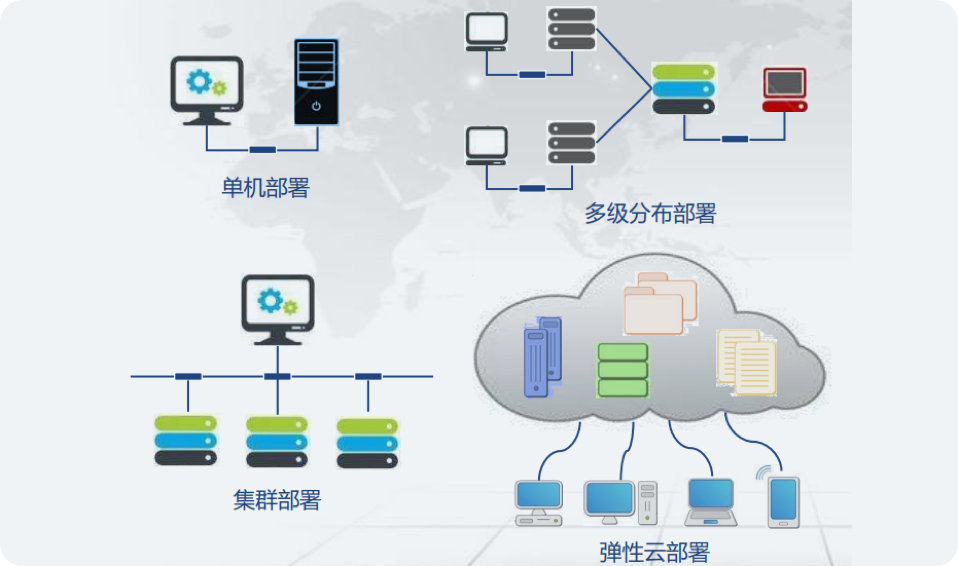 部署方式灵活,根据企业用户和数据规模,灵活等选择部署方式。docker单服务部署,集群部署,多级分布式部署,弹性云部署等。